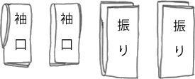 袖口側には「袖口布」、振り側には「振り布」のそれぞれ小布が付く場合と、袖を丸々作り、上着の袖付けに縫い付ける「袖丸」があります。
