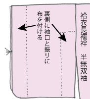 半無双袖も袷衣長襦袢の袖で、着用したときに無双袖に見えるように、袖口側や振り側に長細い共布を付けた袖です。