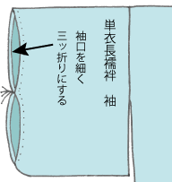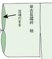 単衣袖は単衣長襦袢の袖で、袖口側は耳端のままであったり、細く三つ折りをします。