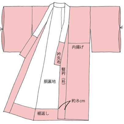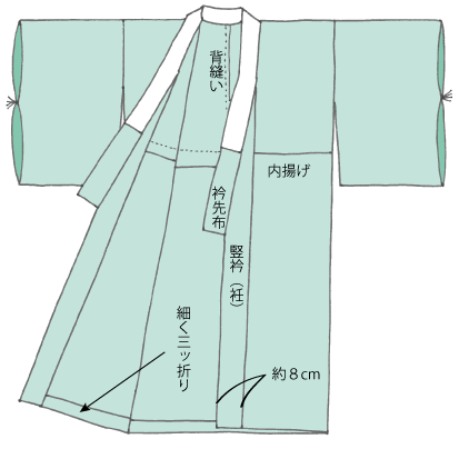 振袖のような大きな丸みがある長襦袢は、同寸の丸みを付けますが、1寸(3.8cm)未満のものは男物長襦袢のように丸みを付けない仕立て方もあります。