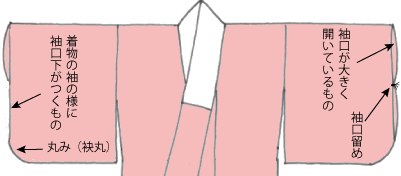 女物襦袢の袖の形は大名袖のように大きく袖口が開いている広袖口のものや、きものの袖のように袖口があり袖口下があるものもあります。