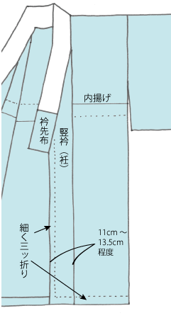 摘まみ竪衿とは、前身頃の衿肩明きから前幅を結んだ線で0.8cm程度摘まんで竪衿(衽)が付いているように見せかけた仕立て方で、子供用のきものの四ッ身に見られる方法です。反物の長さが短くてできますが、背縫いを深く縫うため、肩幅(裄)や身幅を広くできないので制限があります。
