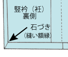 「三つ折りぐけ(石づき)」は単衣長襦袢の裾の状態のことで、前身頃・後身頃など三つ折りにしてくけ付けます。「石づき」は、単衣着物と同じように、褄下先(褄先)を額縁のようにすることをいいます。