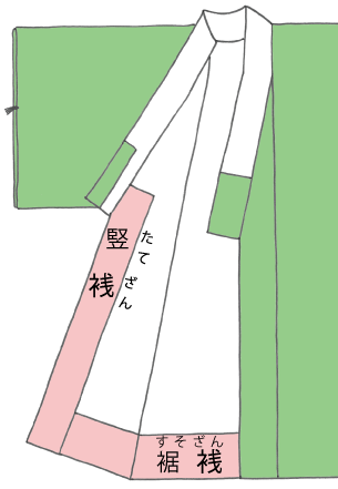 「しず布(竪しず・裾しず)付き」は摘まみ竪衿の袷衣長襦袢に、共地あるいは別布を裾しず(裾返し)や竪しず(竪衿裏)にしたものです。しず布のことを「ざん(衣へんに浅の右側)」ともいい、裾ざん・竪ざんとも言っています。