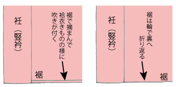 「裾返し」は袷衣長襦袢の裾で、表布を裏側に返したもので、輪のままのものを「裾輪な」と言い、裾で摘まんで袷衣きものの裾のように吹きを作ったものを「裾吹き」といいます。