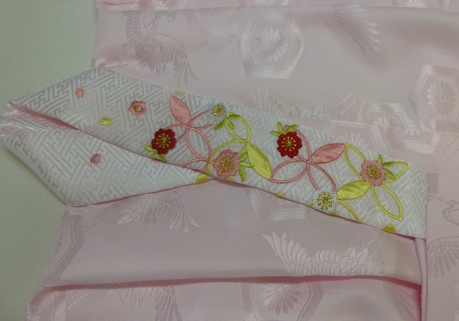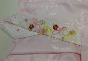 女の子でお宮詣り初着の着物と長襦袢を3歳のお祝いに着られる方もいます。袖は大名袖となっていますので、きものは袖口と丸みを、長襦袢は丸みを付ける必要があります。紐の位置も高く付いているので下げた方がよいでしょう。