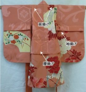 子供の成長は早く、体格に合わせてで作ってしまうと着られる期間が非常に短くなってしまうので、少々幅や丈を大きめに作り、腰揚げや肩揚げなどを施して体格に合わせる工夫がされている。七五三詣りによく見られるように、その肩揚げ・腰揚げなどが子供の可愛らしさを引き立てています。